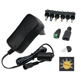 Adaptateur secteur à tension de sortie régulée commutable entre 3 et 12 Vcc.