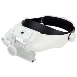 Loupe binoculaire à visière ajustable, équipée de 3 LEDs orientables (gauche, droite, haut, bas) avec 2 niveaux de luminosité.