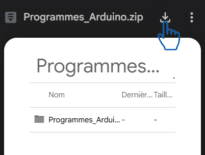 4. Téléchargement du pack de programmes Arduino : Ce tutoriel détaille l'utilisation de chaque capteur ou d'une fonction avec un exemple de programme. Chaque programme ajoute une fonction au projet : Un fichier .ZIP avec les 6 exemples de programmes est à télécharger à cette adresse : Google Drive. Ou chaque programme est téléchargeable individuellement en suivant ce lien.