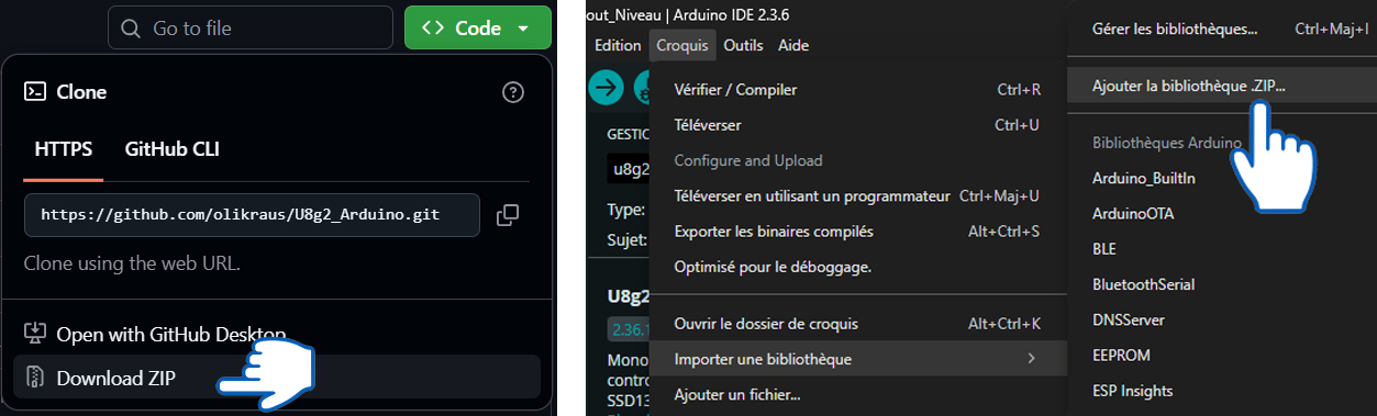 Une fois le fichier ZIP téléchargé, ajoutez-le à l'IDE via croquis → importer une librairie. |