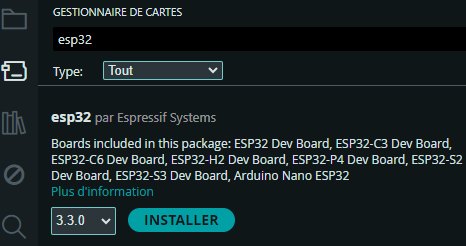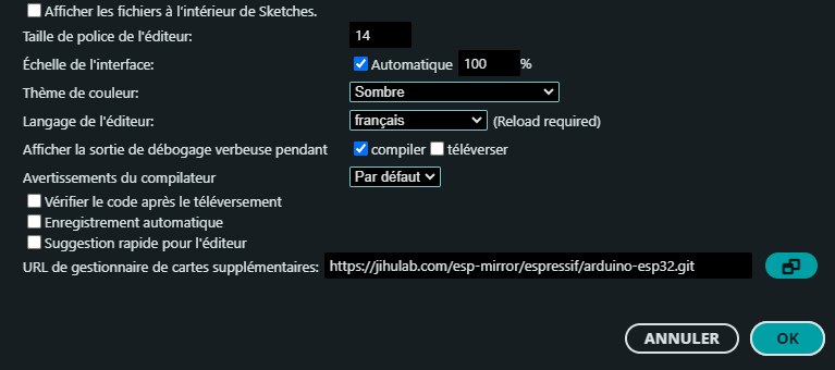 1. Préparation de l'IDE Arduino : De base, l'IDE Arduino ne comporte pas les cartes et les extensions nécessaires pour programmes des microcontrôleurs ESP32. Cette programmation requiert l'installation d'un package additionnel directement via l'IDE Arduino. Rendez-vous dans les préférences de l'IDE (fichier -> préférences) puis cliquez sur URL de gestionnaire de cartes : Copiez et collez le lien : https://jihulab.com/esp-mirror/espressif/arduino-esp32.git Validez avec OK puis fermez les préférences. |