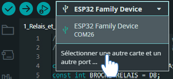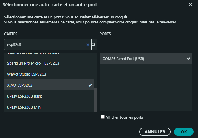 3. Sélection de la carte et du port série virtuel (COM) : La carte connectée, ouvrez le menu déroulant de sélection de carte : Recherchez ESP32C3 puis sélectionnez XIAO_ESP32C3. Sélectionnez également le port COM où est connectée virtuellement la carte. Remarque : Il se peut que vous deviez sélectionner la carte et le port à chaque fois que vous ouvrez un programme. |