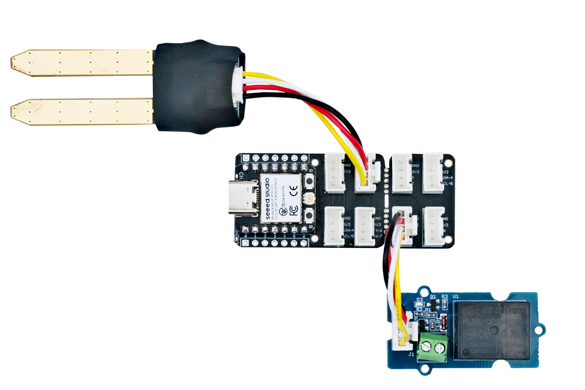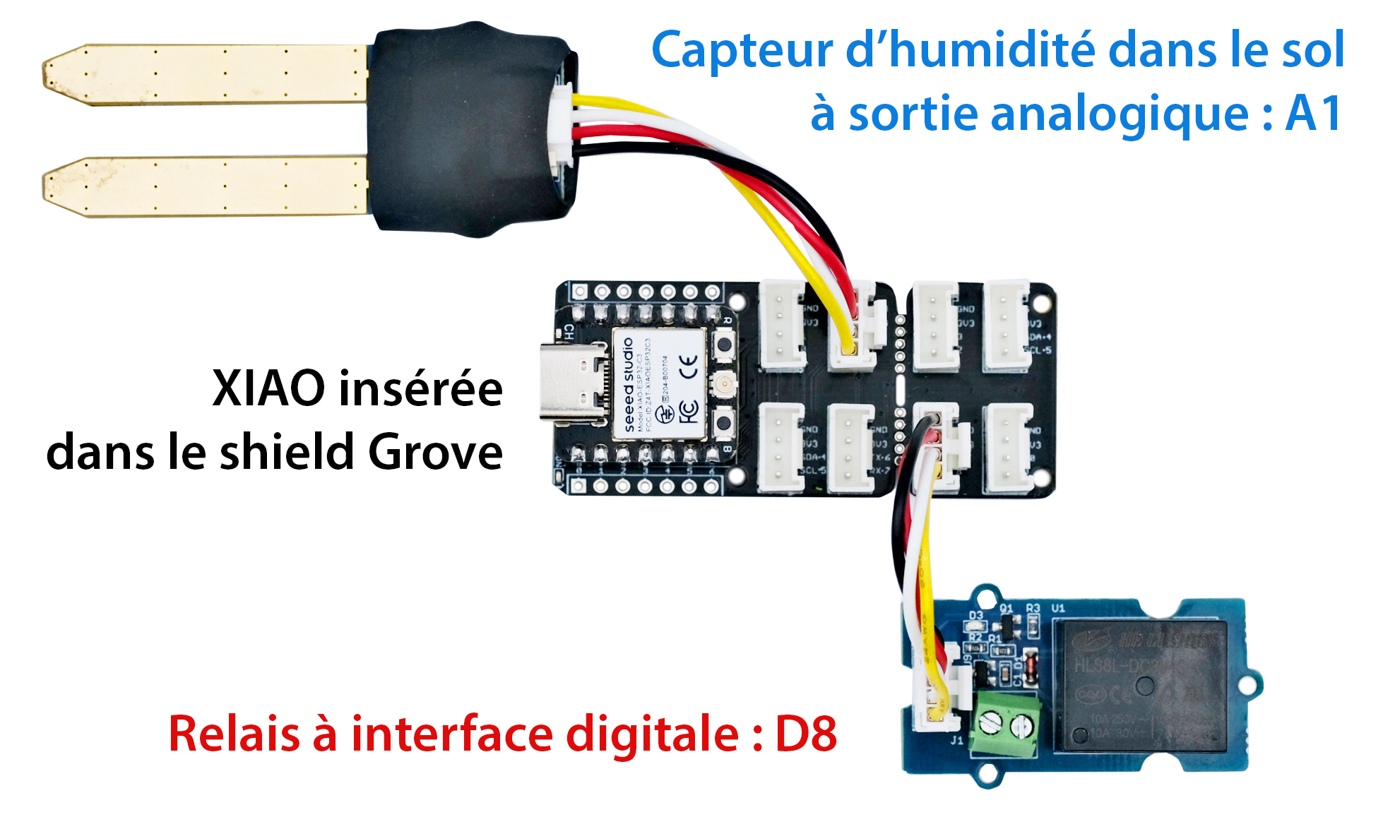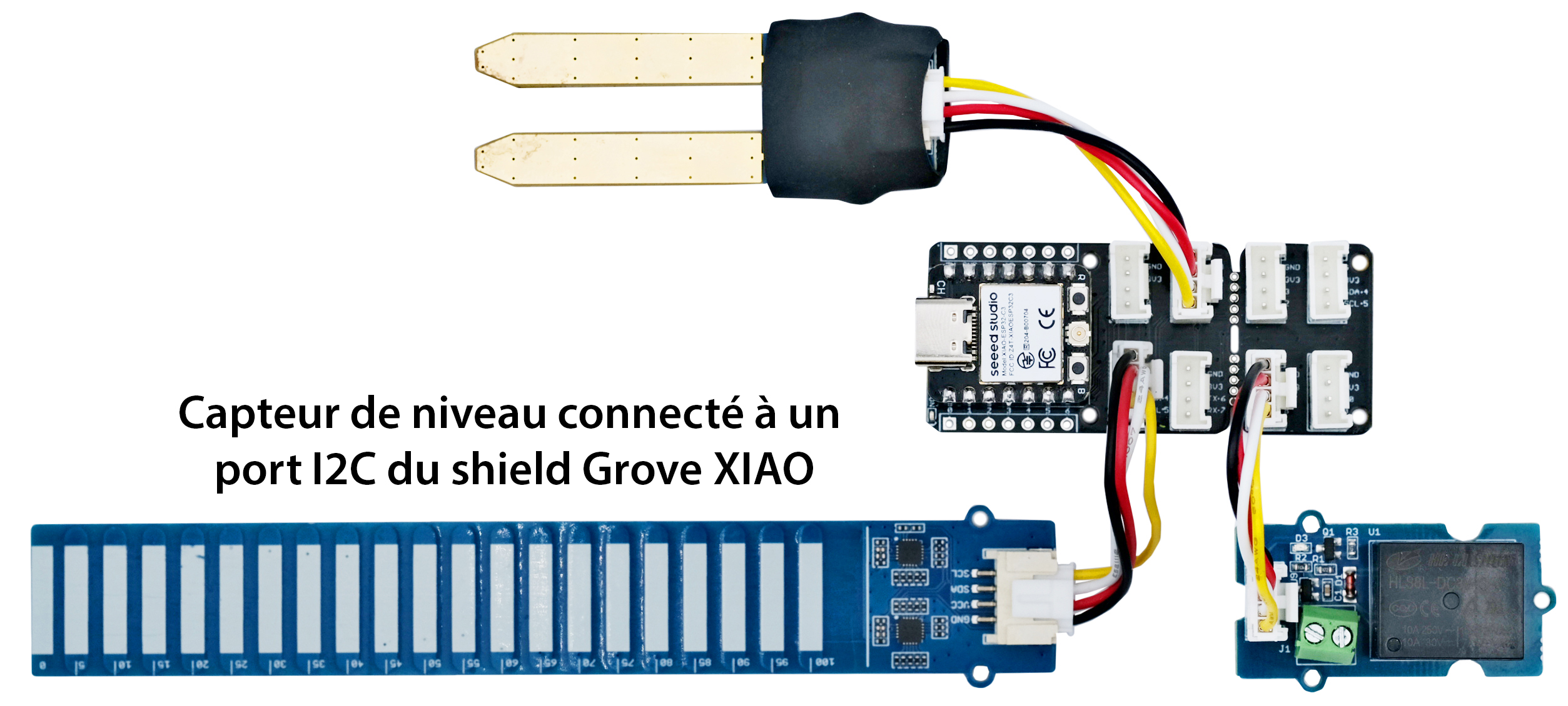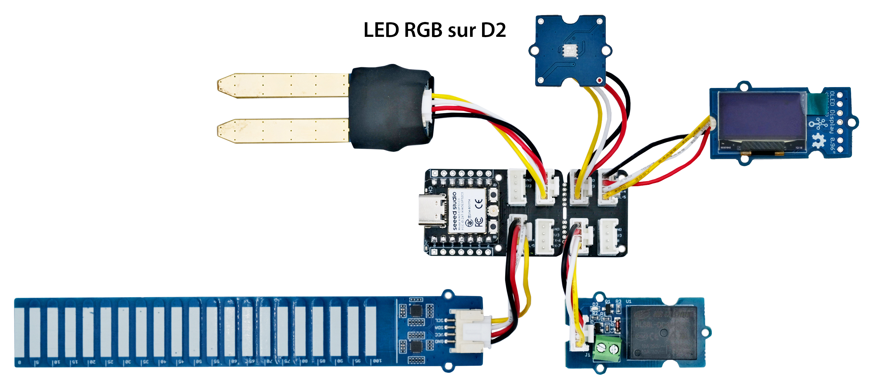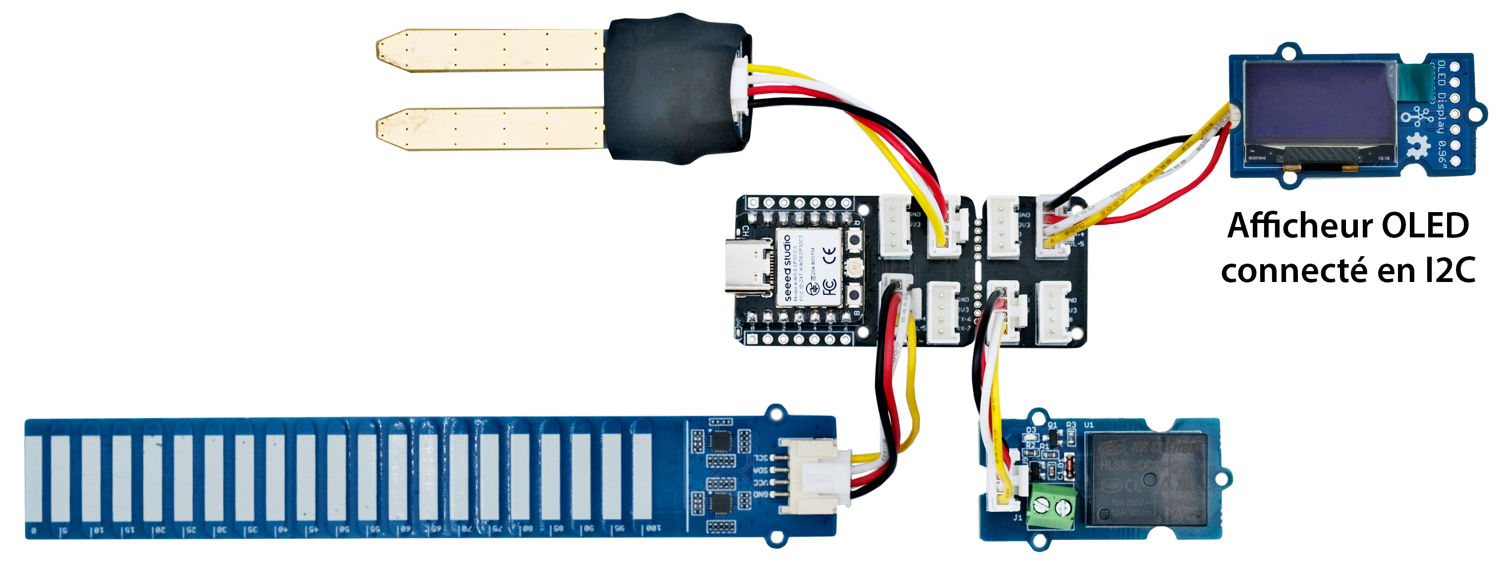 | Modules Grove : - 1 x carte XIAO ESP32C3 102010633 - 1 x shield Grove pour carte XIAO 103020312 - 1 x capteur d’humidité dans le sol Grove 101020008 - 1 x capteur de niveau d’eau Grove 101020635 - 1 x afficheur OLED Grove 104020249 - 1 x module à LED RGB Grove 104020169 - 1 x module relais Grove 103020005 |