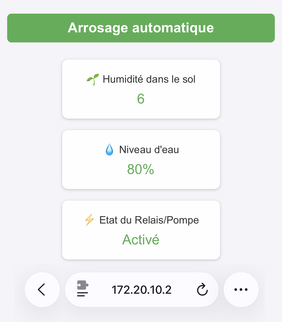 L’ESP32 intègre une interface Wi-Fi qui lui permet d’héberger une page web locale directement stockée dans le microcontrôleur (fichier HTML dans le programme Arduino). Cette partie en HTML est entièrement personnalisable directement via l'IDE Arduino. Depuis un smartphone, une tablette ou un PC connecté au même réseau local, vous accédez au tableau de bord et pouvez consulter l’état du système en temps réel.