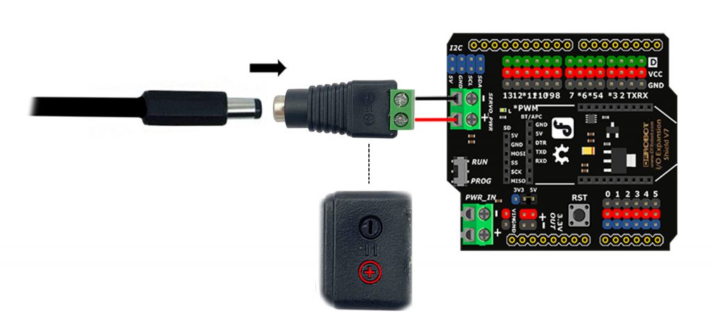 3ème étape: connexion de l’alimentation.Raccordez maintenant l’adaptateur 5,5 x 2,1 mm au bornier à vis du shield avec du fil de câblage. Remarque: attention aux polarités ! Cet adaptateur indique les pôles positif et négatif. Ensuite branchez l’alimentation 5 Vcc dans l’adaptateur à bornier. |