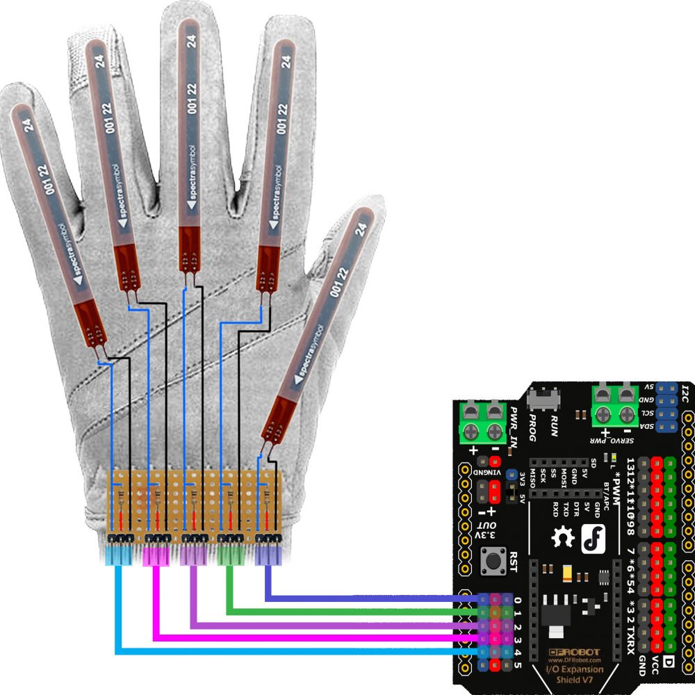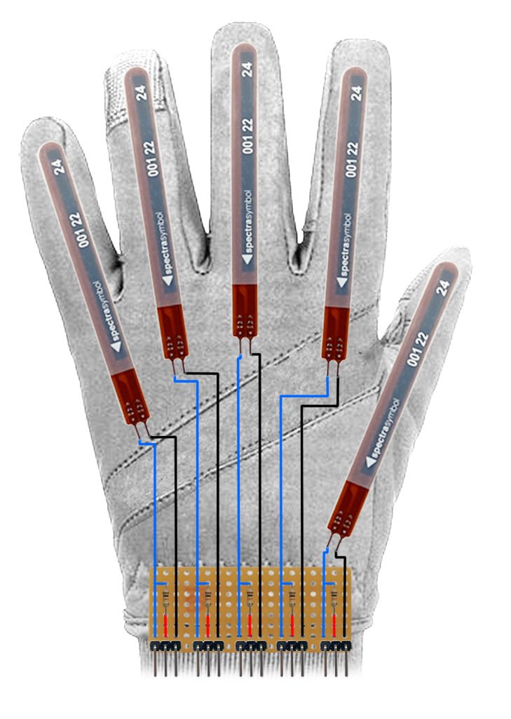 Dans un premier temps, nous allons prendre le gant et placer les 5 capteurs de flexion sur chaque doigt. Etape 1: Positionnez la plaque d’essais sur le gant. Mesurez la longueur de fil nécessaire vers chaque capteur en ajoutant 2 cm de marge pour l’articulation. Etape 2: Soudez maintenant les capteurs de flexion au câble précédemment mesuré. Soudez l’autre extrémité des câbles à la plaque d’essais. Enfin, soudez les résistances pour chaque capteur en laissant un emplacement libre pour le connecteur. Les soudures terminées, fixez la plaque d’essais et les capteurs au gant. La solution la plus efficace est de coudre les capteurs de flexion et la plaque d’essais au gant avec du simple fil de couture. Remarques: