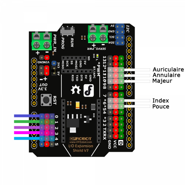 1ère étape: connexion des capteurs de flexion au shield.Cette étape vous permet de visualiser l’emplacement de raccordement des 5 capteurs de flexion. Ceux-ci se connectent simplement sur les connecteurs analogiques 3 broches GVS (Ground, Vcc, Signal) du shield E/S Gravity V7. Ce shield facilite grandement le raccordement de ce type d’éléments en proposant une connectique adaptée à l’alimentation.