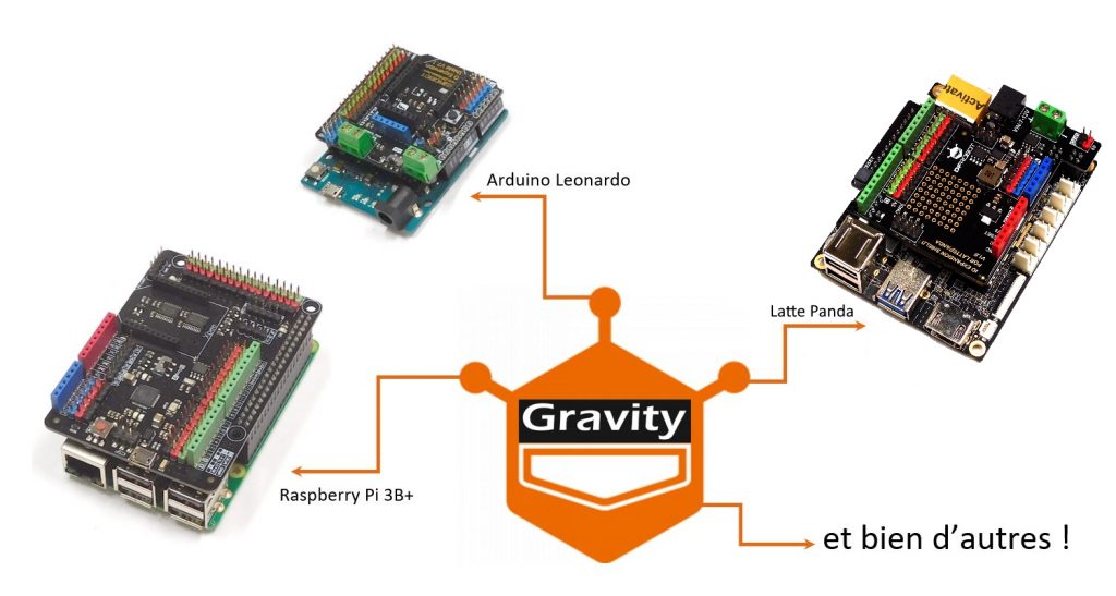 Il suffit simplement de choisir la carte de connexion [Shield] Gravity compatible avec votre plateforme et de prendre les composants disposant du système Gravity.
