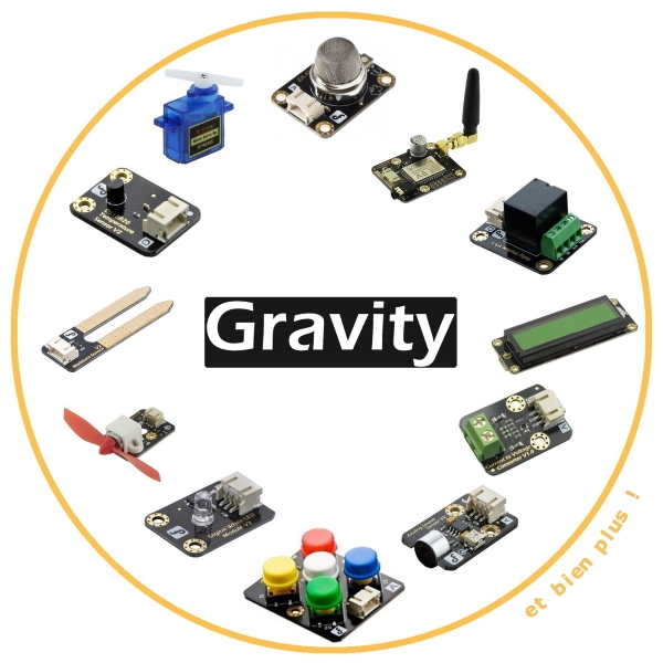 Gravity est un système de connecteur plug-and-play développé par DFRobot. Les modules Gravity ont été conçus pour le prototypage rapide. Gravity propose une large gamme de capteurs et d’actionneurs. Les modules sont enfichables sans soudure. |