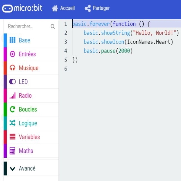 Pour coder en blocs ou en JavaScript, il faut utiliser l’éditeur MakeCode.