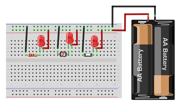 Si certains de vos composants ont besoin de partager la même source d’alimentation, reliez les au bus d’alimentation. De ce bus d’alimentation, vous pouvez relier votre plaque de montage à votre source d’alimentation. Faîtes attention à la polarité de vos composants. |