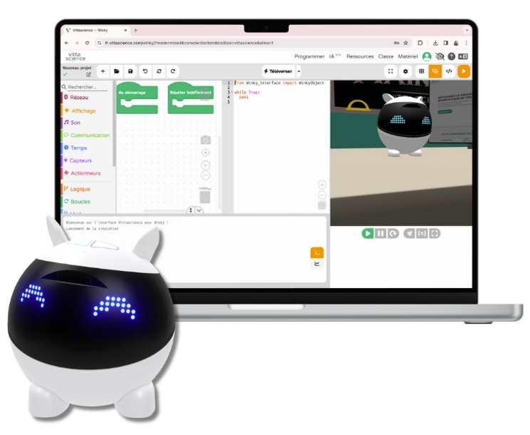 Conçue en collaboration avec Vittascience, la plateforme de programmation scratch Winky dédiée aux enseignants et aux élèves, permet un accès à Winky en format virtuel.