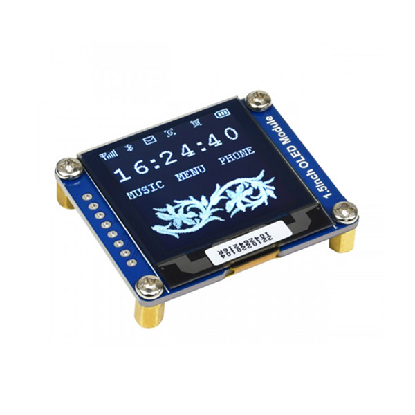 Afficheur OLED 1,5" blanc sur fond noir de 128 x 128 pixels à 16 niveaux de gris. Pilotable via une carte compatible Arduino, Raspberry Pi ou STM32 en I2C ou SPI.