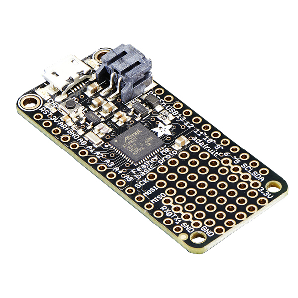 Module Adafruit Feather M0 compatible Arduino basé sur un SAMD21 et un module radio RFM69 868 MHz permettant des communications sans fil entre plusieurs modules.