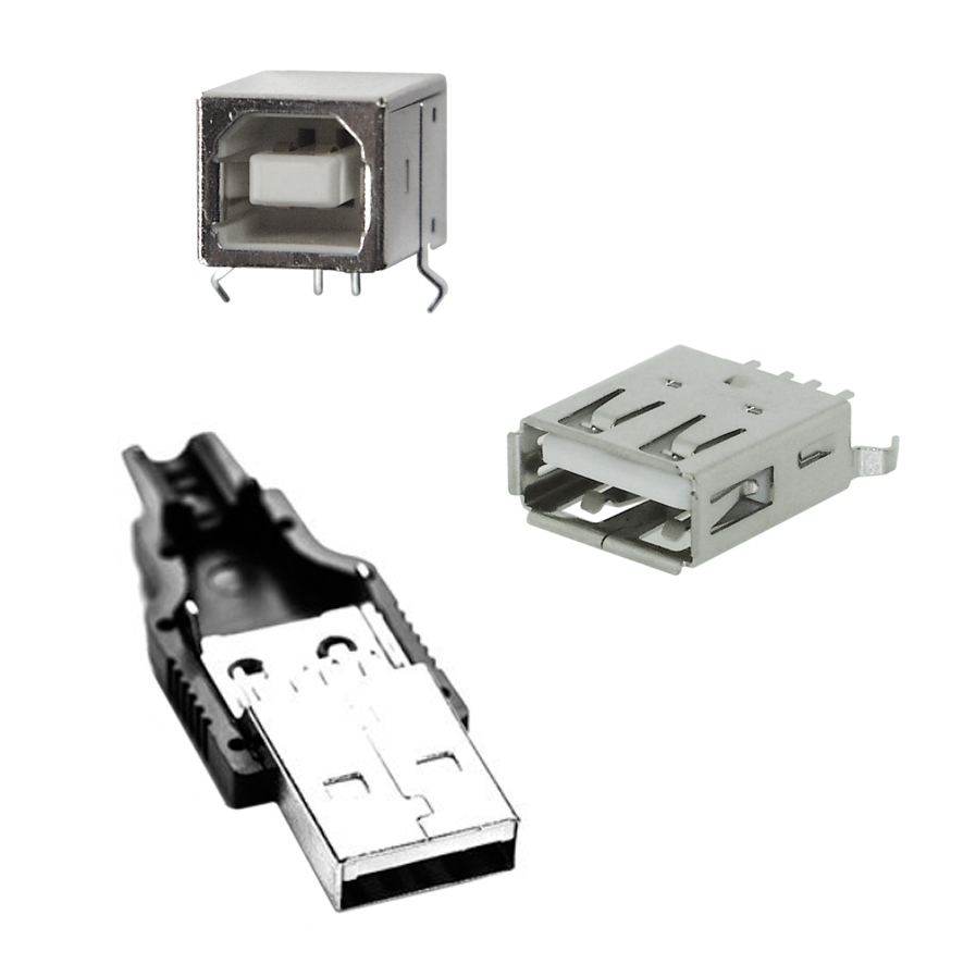 Connecteur femelle USB constitué de deux demi-coquilles en plastique et d'un connecteur USB femelle à souder sur fils.