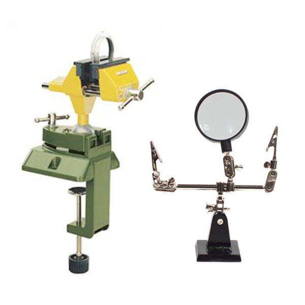 Support universel articulable en tous sens grâce à 6 rotules, comprenant une double loupe, deux leds d'éclairage et un support de fer à souder.