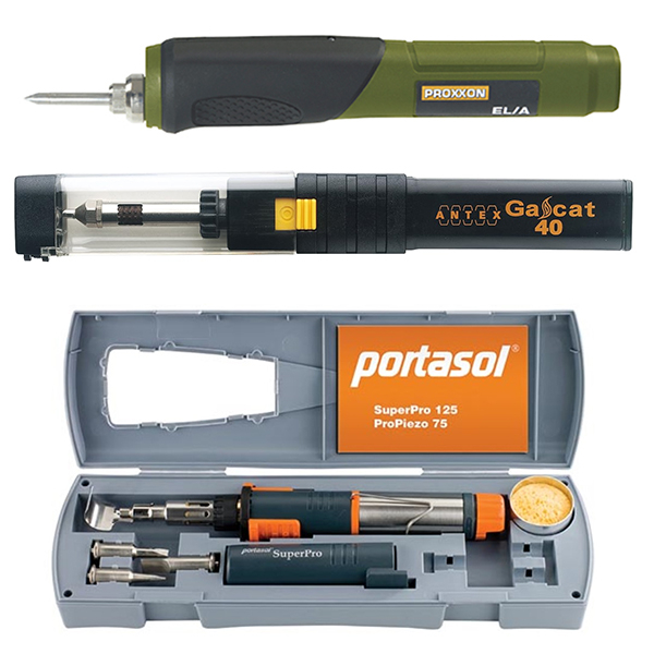 Fer à souder à gaz totalement autonome, qui réunit en un seul instrument les fonctions de fer à souder, chalumeau, générateur d'air chaud et couteau grâce à 4 accessoires interchangeables.