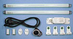 Mallette en PVC contenant 4 tubes UV de 8 W ainsi que les accessoires (ballasts, starters, supports).
